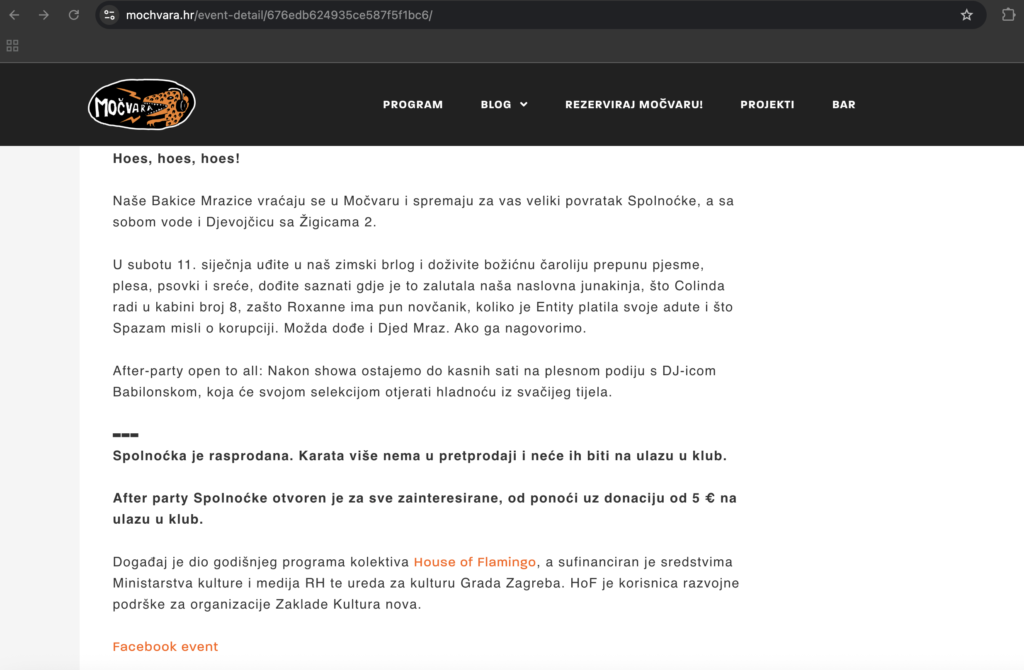 I dok se Ministarstvo brani “birokratskim rječnikom”, organizatori spornog događaja ih izravno demantiraju. Na službenim stranicama kluba Močvara i platformi CoreEvent, kod najave “Spolnoćke”, stoji jasna zahvala pokroviteljima: