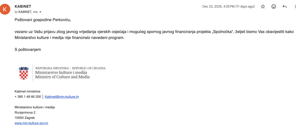 Prije svega nekoliko dana, 23. prosinca 2025., iz Kabineta ministrice stigao mi je dopis u kojem crno na bijelo tvrde: „Ministarstvo kulture i medija nije financiralo navedeni program“.